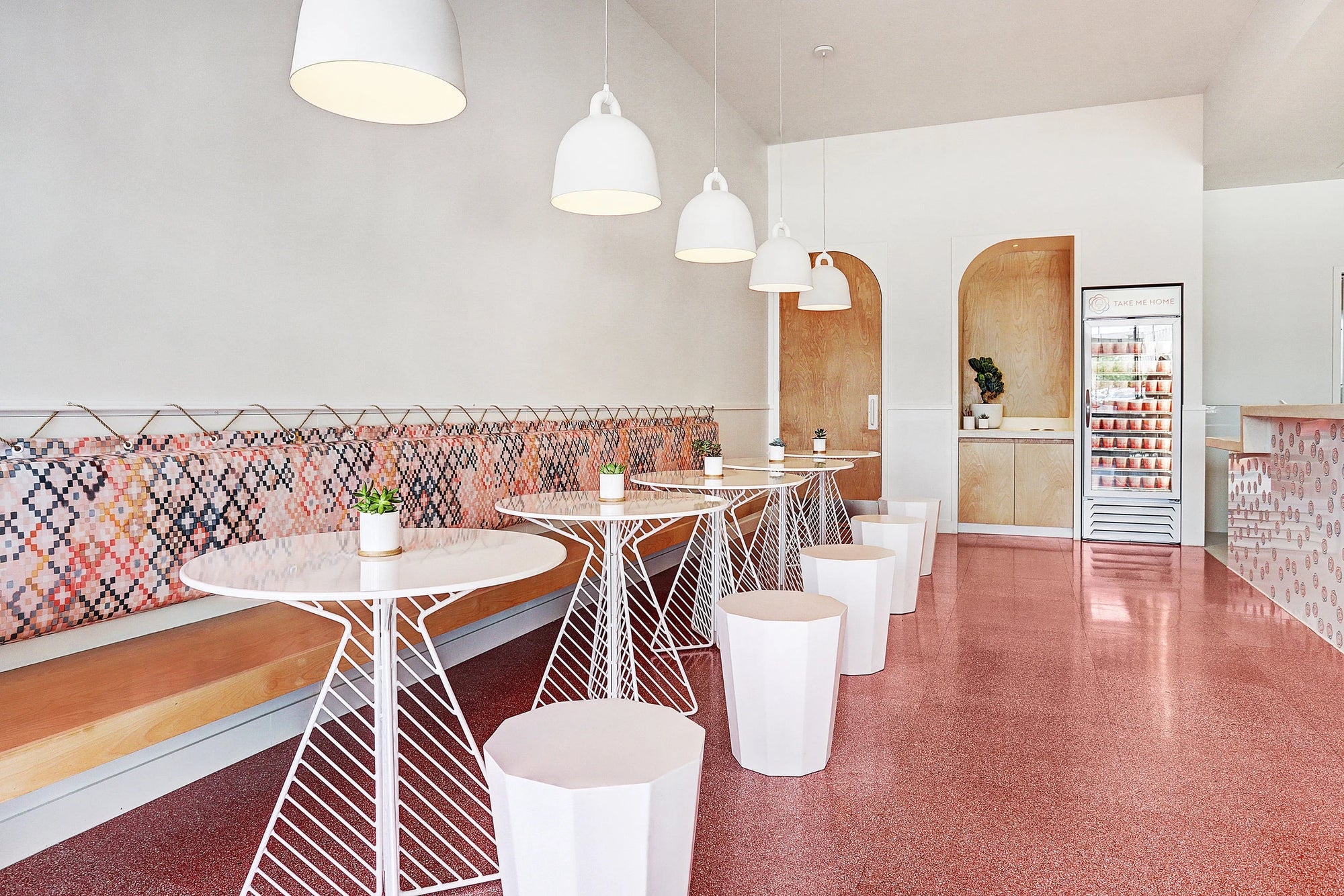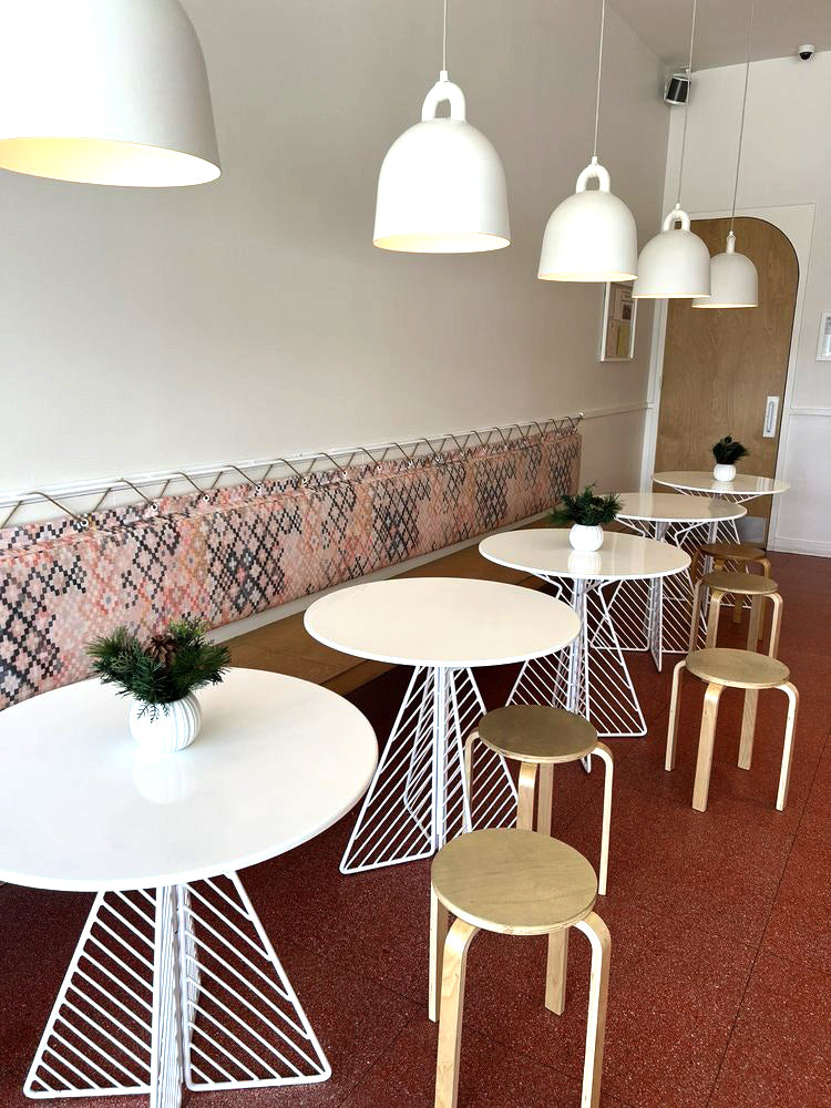 Our products were curated to fit seamlessly into this high-traffic restaurant environment, where maintaining a "light and airy" feel is essential to the customer experience. The Café Tables featuring our signature Diagonal leg pattern were selected in a crisp white to complement the shop's beautiful color palette of dusty, muted pastels. In these limited space areas, the geometric lines of the diagonal legs provide a sense of movement and visual interest that doesn't crowd the room, allowing the vibrant colors and "bright terrazzo effects" to take center stage. The white finish offers a clean, sophisticated touch that bridges the gap between industrial materials and the playful, artisan spirit of the brand.
