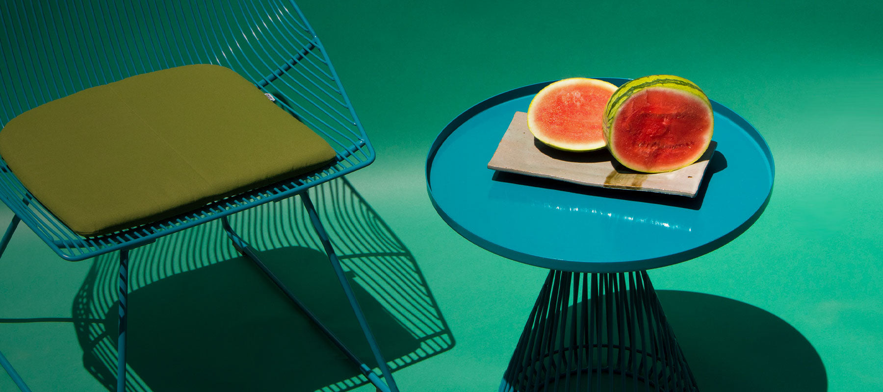 All furniture needs maintenance, and Bend pieces are no exception. To extend the life of our powder-coated and plated finishes, store furniture in dry, ventilated areas when not in use, protect against chips and scratches, and use pads under decorative objects. Add glides to protect feet and floors, clean off bird droppings promptly, and tighten screws every 4–6 months or as needed.