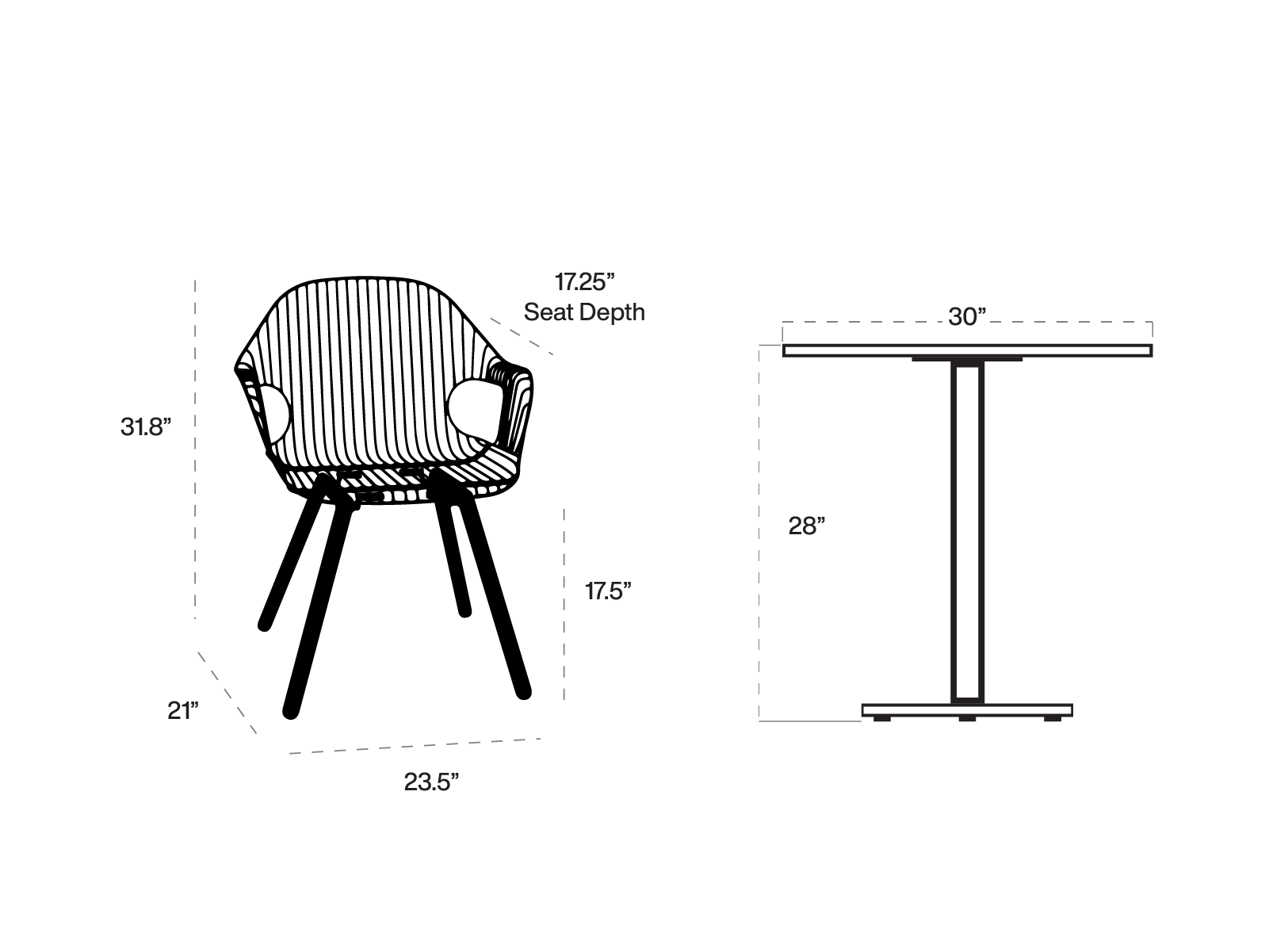 This set pairs the Rita Arm Chair with the 30" Pedestal Table, offering a seamless blend of form and function. Designed for both indoor and outdoor spaces, each piece is powder-coated for longevity, ensuring a versatile set that lasts for years. Whether for a cozy dining nook or an open-air patio, this bundle delivers versatility without compromise.